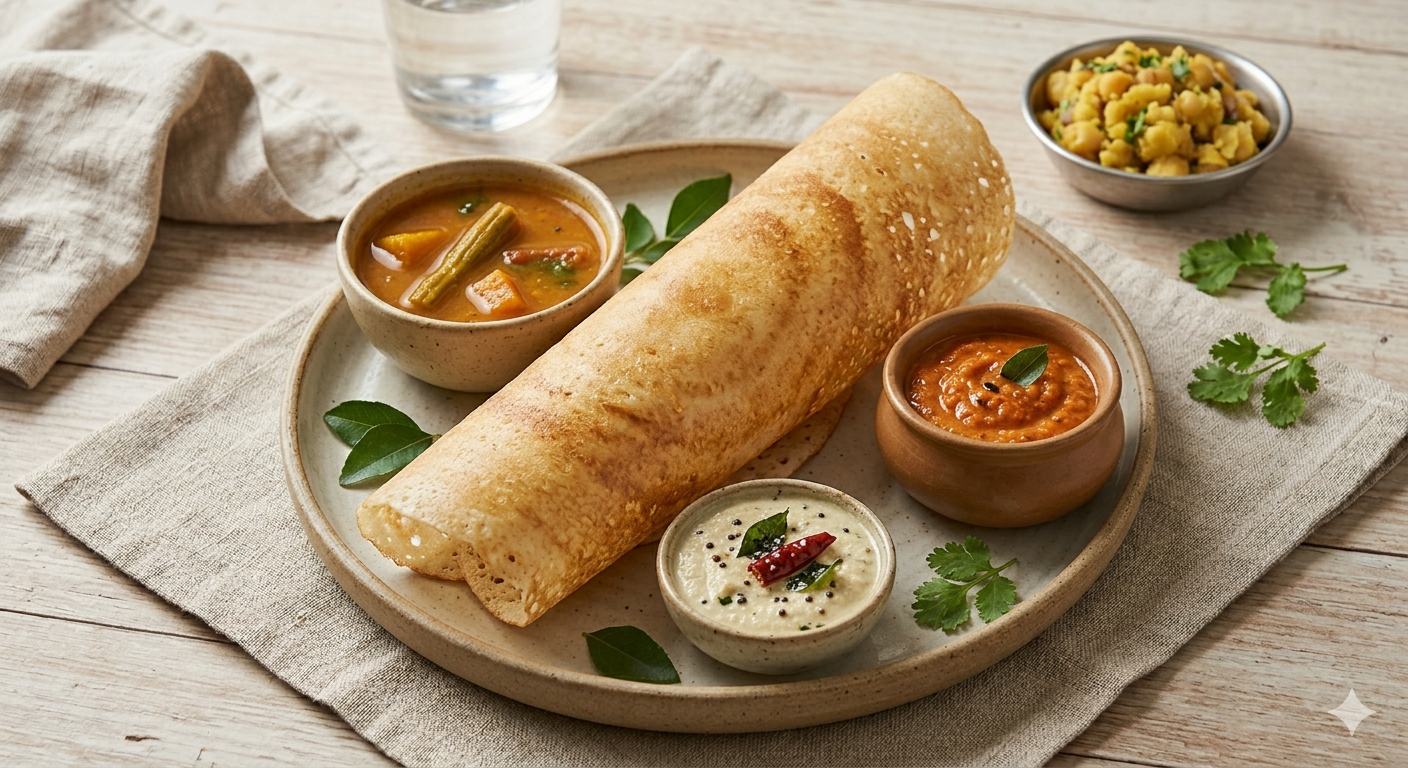 Crispy dosa made from fermented rice batter | Golden and crunchy outside, soft inside | Served with sambar and chutney | Perfect for breakfast or snacks