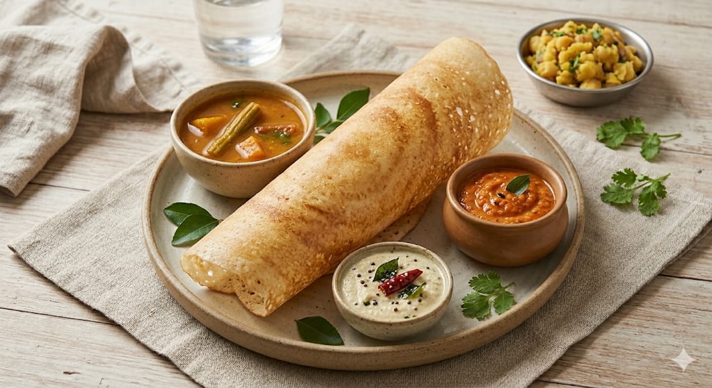 Crispy dosa made with fermented rice batter | Golden and crunchy outside, soft inside | Served with sambar and chutney | Perfect for a light snack or breakfast