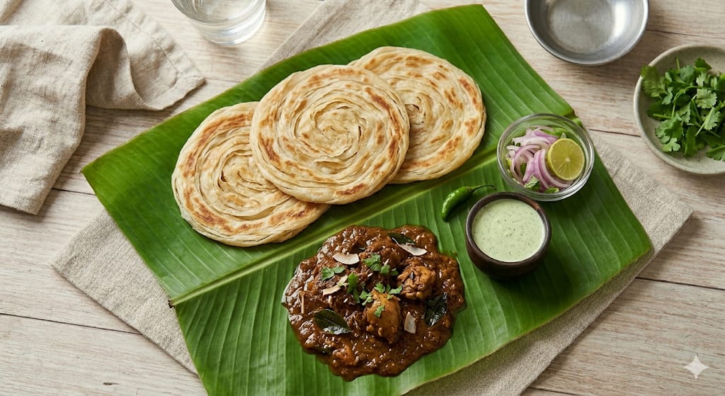 Flaky and layered flatbread | Soft and satisfying | Perfect with curries or alone | A beloved South Indian staple