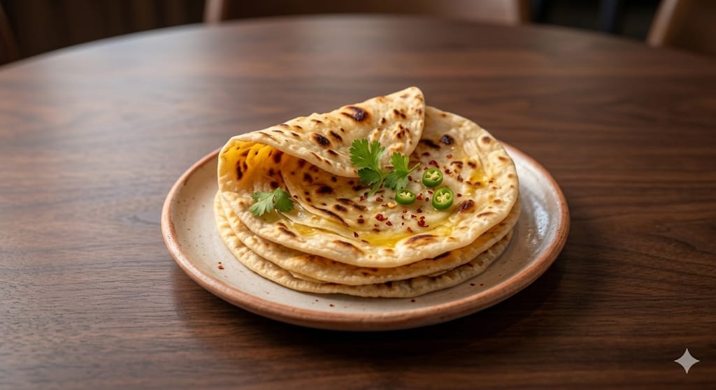 Layered whole wheat flatbread | Crisp and flaky | Excellent with yogurt or pickles | Common Indian breakfast item