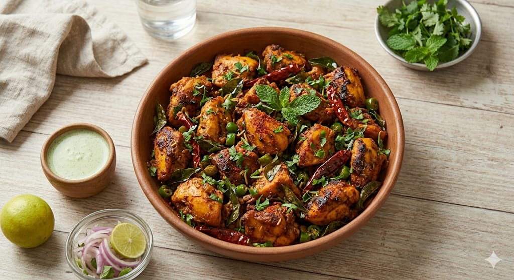 Spicy and spicy deep-fried chicken cubes | Tangy with a hint of curry leaves | Served as an appetiser | Loved by South Indians