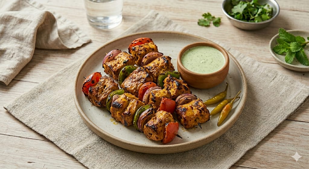 Marinated in green herbs and spices | Grilled for a smoky flavor | Served hot | Ideal for health-conscious diners