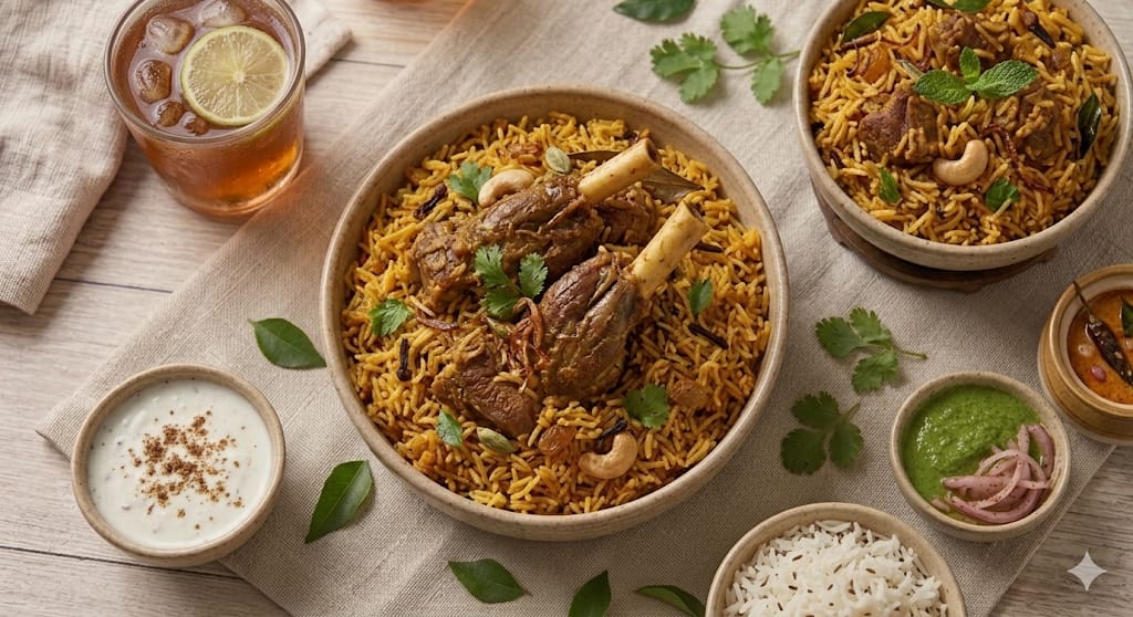 Tandoori chicken with saffron-infused rice | Juicy and flavorful | Accompanied by refreshing raita | A delightful biryani experience