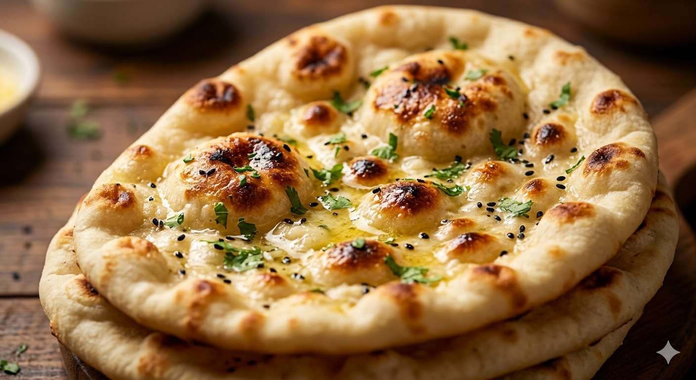 Naan topped with minced garlic and herbs | Aromatic and savory | Pairs well with Indian dishes | Delicious on its own