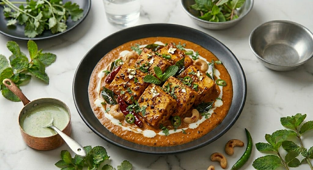 Paneer pieces in a creamy marinade | Mildly spiced and rich | Hastens to post like raita | Creamy excellence