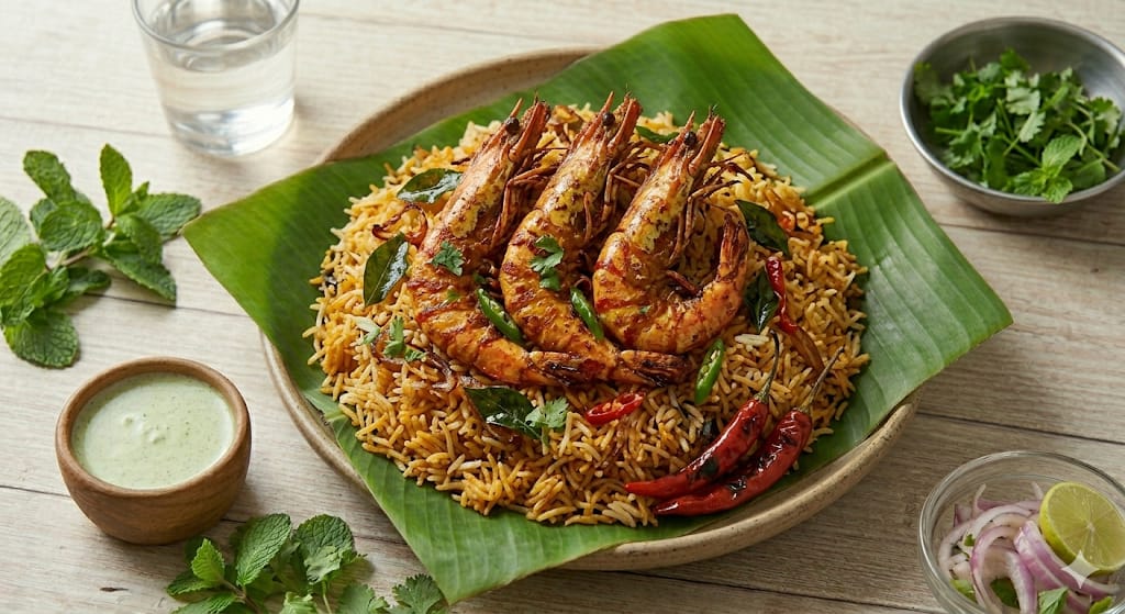 Juicy prawns cooked with basmati rice | Mildly spiced for delicate flavor | Served with traditional sides | Perfect for seafood lovers